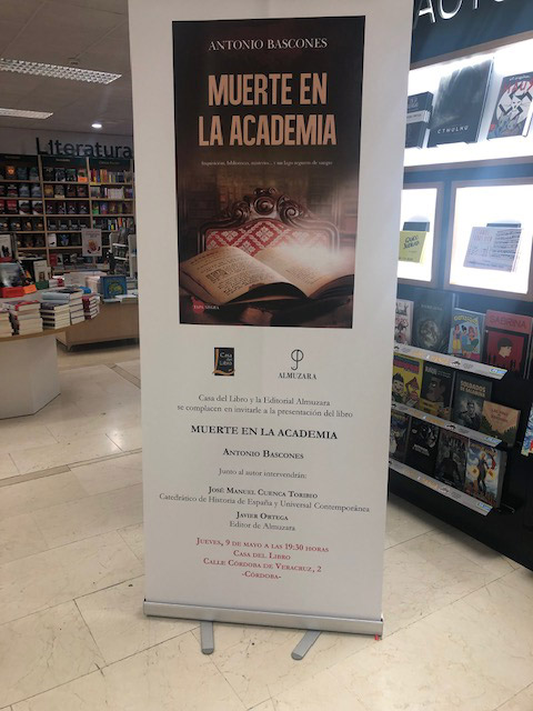 El día 9 de mayo se presentó en los locales de la prestigiosa Casa de libro de la ciudad de Córdoba la novela de Muerte en la Academia de Antonio Bascones. En el acto intervinieron el Prof. José Manuel Cuenca Toribio y por parte de la casa editorial el editor Javier Ortega. El primero después de hacer una pormenorizada descripción del autor presentó la novela como una trama policíaca y de suspense enmarcada en los siglos XVII y XVIII. Su exposición fue rica en datos históricos y descriptivos que hizo que el auditorio mantuviese la atención durante todo el tiempo. Con la ingente cultura del Prof. Cuenca la presentación se enriqueció de datos y fechas interesantes para entender la trama de la novela. Javier Ortega, así mismo, hizo múltiples referencias a la calidad del libro y del honor que significa para la editorial tener este tipo de autores y de obras que hacen que sean muy solicitadas por el público en general. Enmarcó, también, la novela en un ciclo histórico de los siglos ya señalados. Hizo una especial referencia a la introducción, porque según él, es en esta primera parte cuando se da cuenta el lector de los primeros pasos para escribir la novela, el porqué, los motivos y los distintos aspectos que confluyen en la misma.
